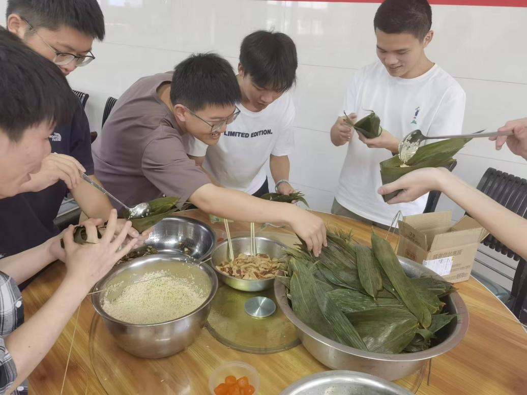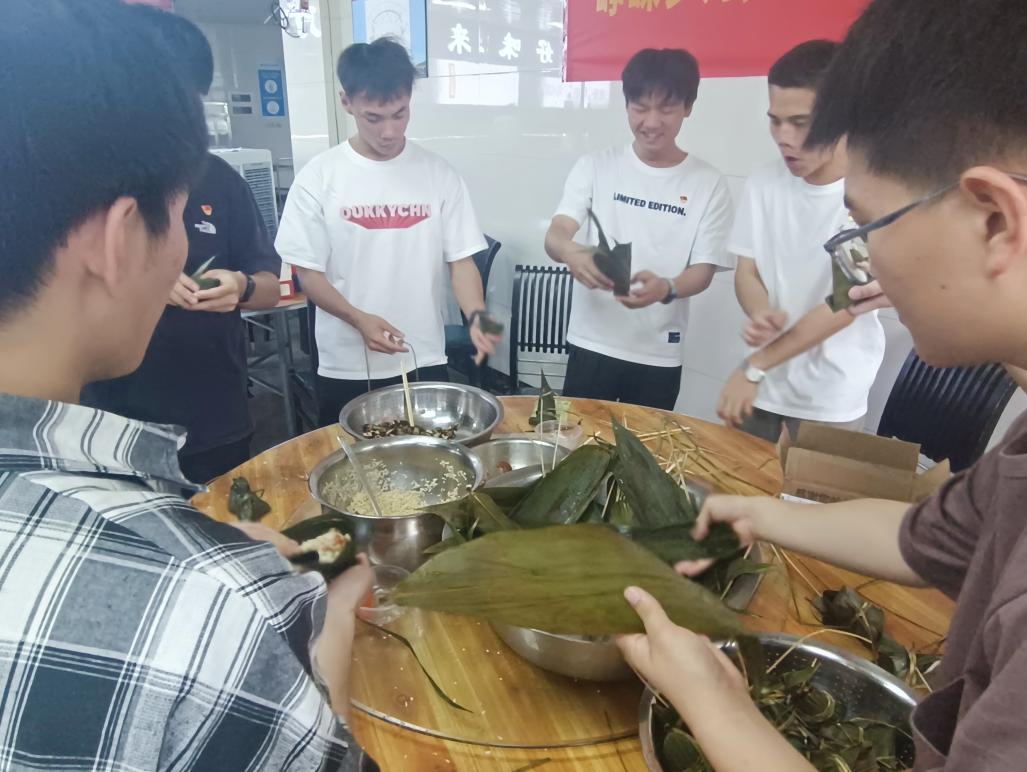 活动开始前,支部学生党员吴惠泽负责采购相关食材及物资,并进行活动现场布置本次活动主要分为两个环节,一是包粽子,二是绣香囊。在食堂阿姨的指导下支部成员们兴奋又认真地学习起了如何包粽子。大家围坐一团,手艺也从生疏到熟练,虽然过程曲折,但大家始终未曾放弃,边边交流心得,尽情体验着亲手包粽子的乐趣随后,由食堂工作人员帮助大家将包好的粽子进行蒸煮。