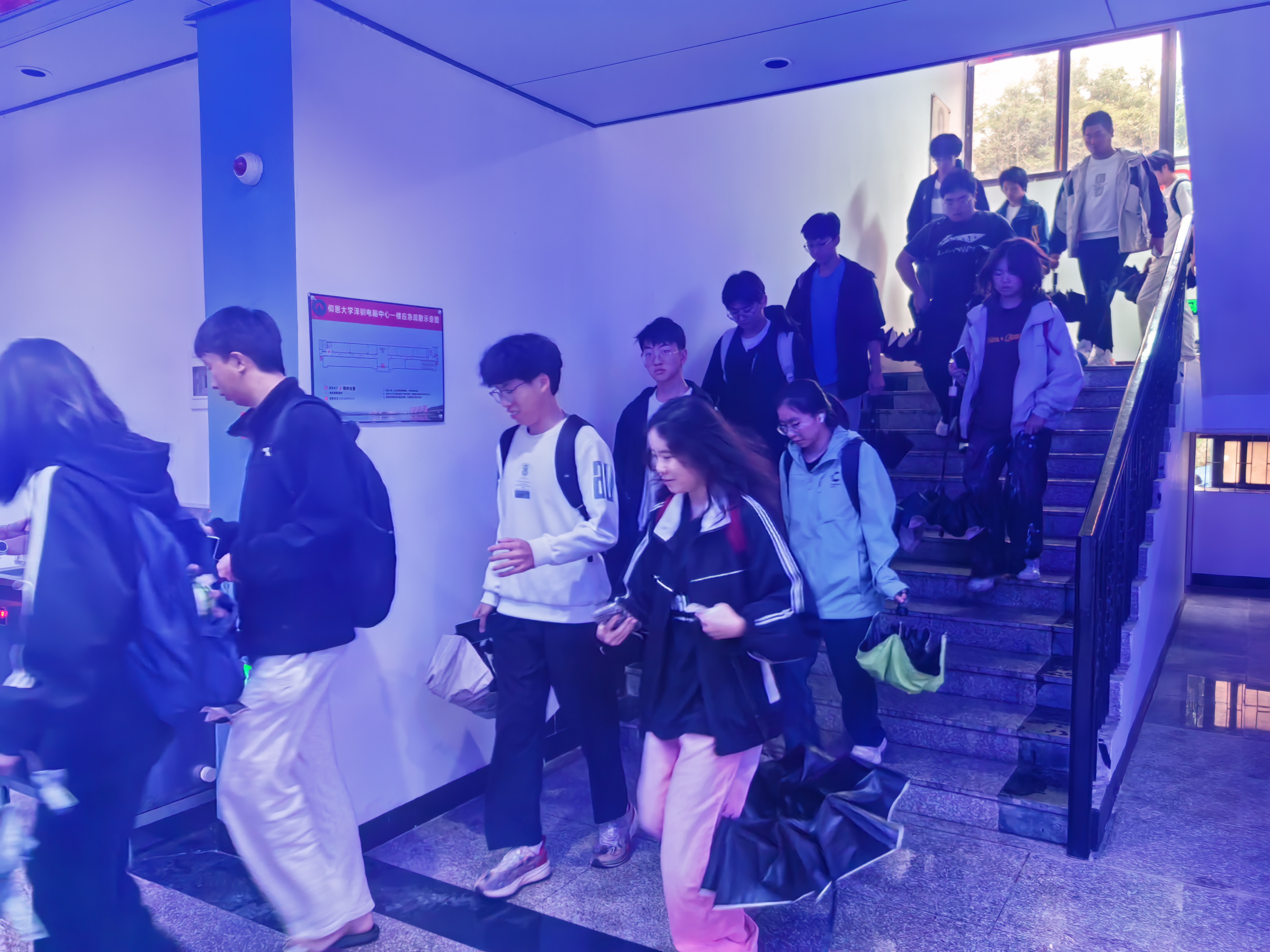 随着急促的警报声响起,演练开始,参演人员迅速反应,用手捂住口鼻,低姿前行,按照预定的逃生路线有序撤离。在疏散过程中,大家冷静沉着,相互提醒,展现出了良好的应急素养。从安全出口楼梯迅速有序地向楼下空地集合。在疏散过程中,大家冷静沉着,相互协助,充分展现了良好的团队协作精神。