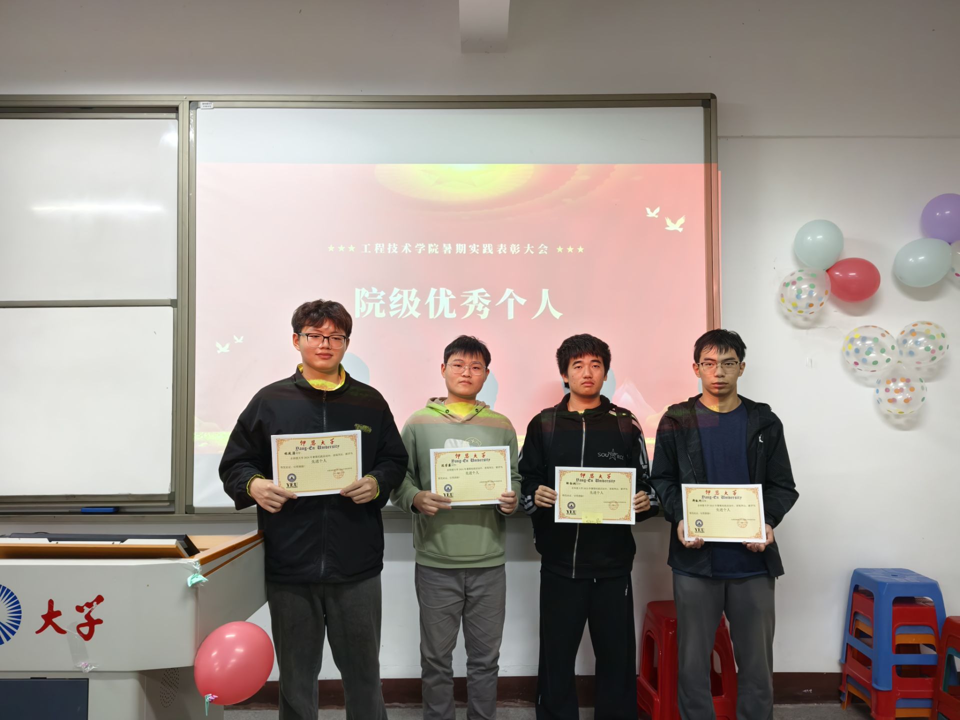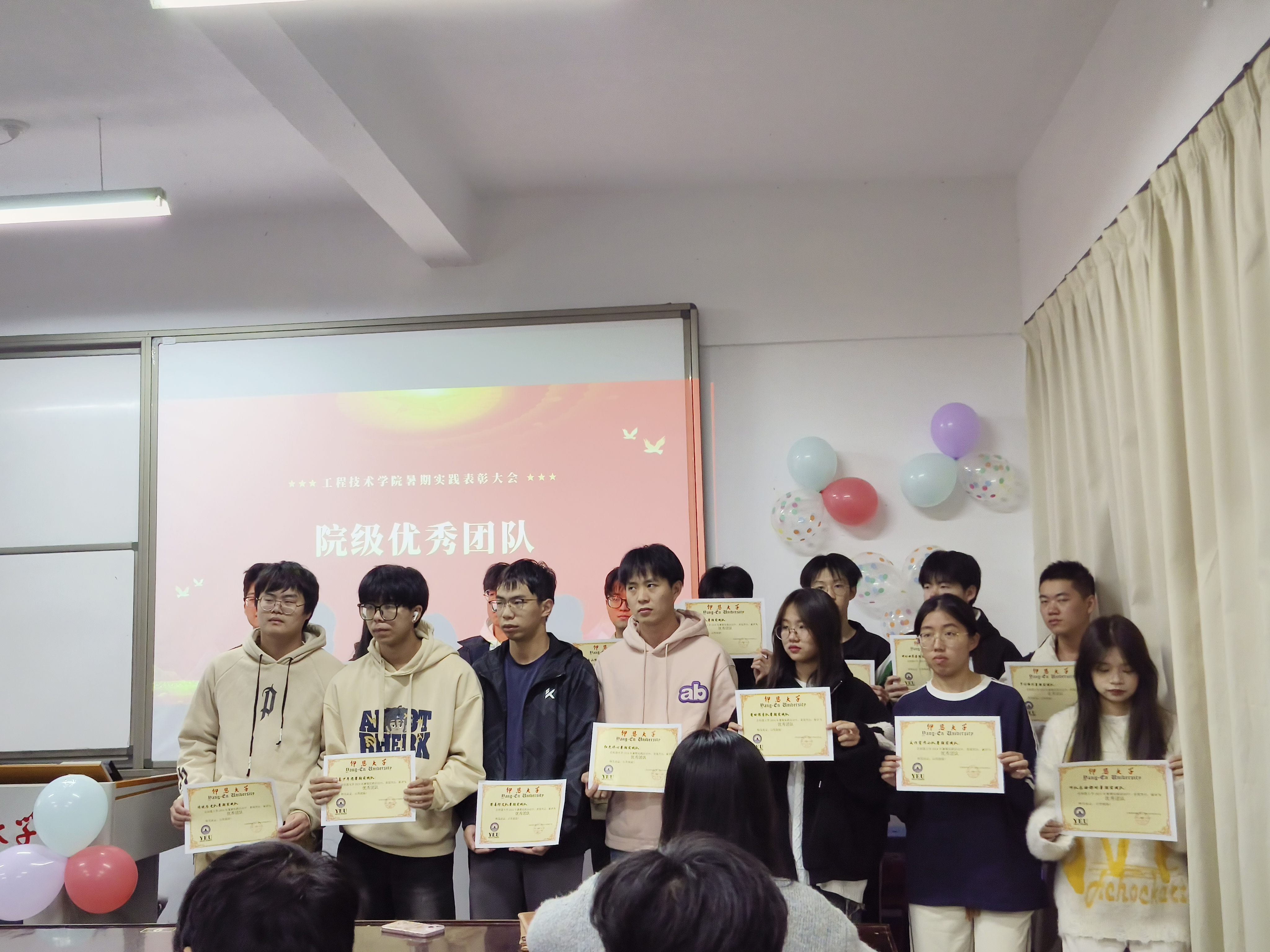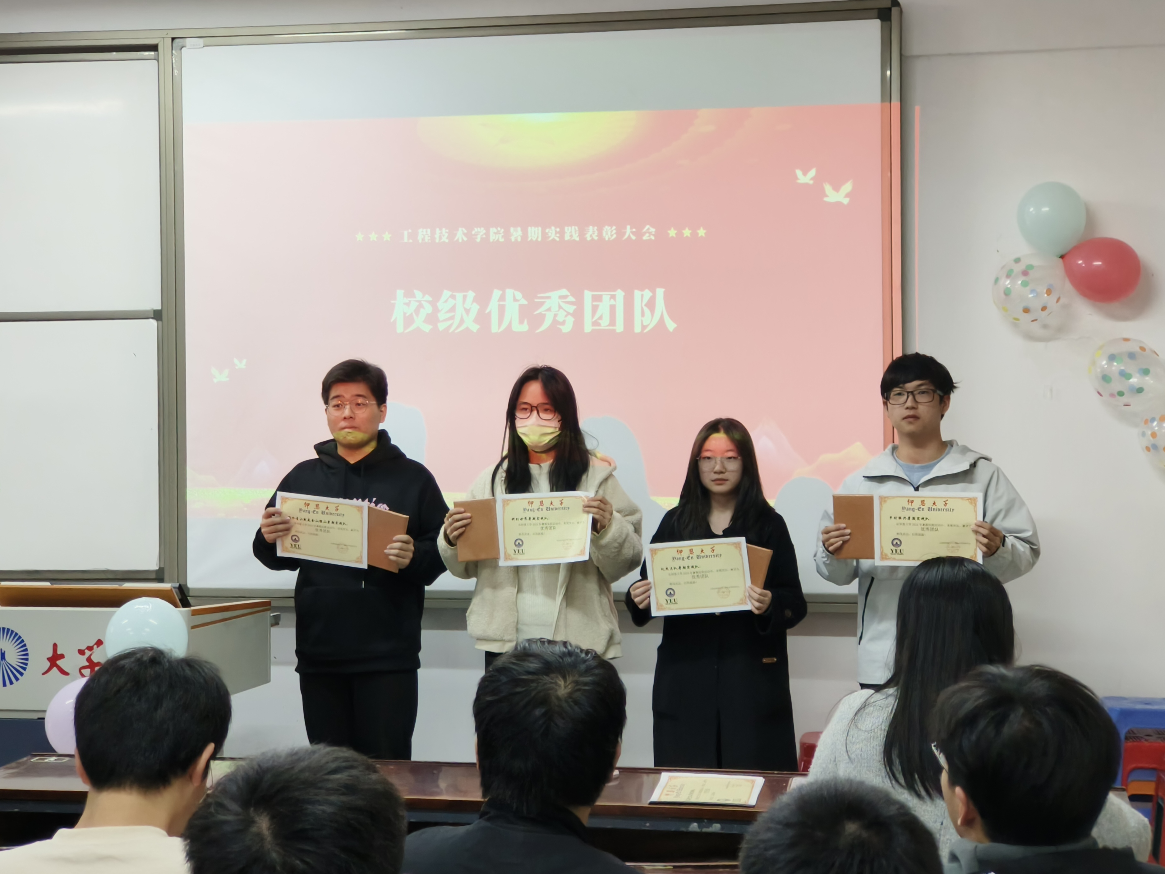 大会伊始,主持人详细介绍了参会人员及活动背景,并宣读表彰决定。在热烈的掌声中,为暑期社会实践中的优秀团队和个人颁发证书,这不仅是对他们辛勤付出的肯定,也是对他们未来努力的激励。