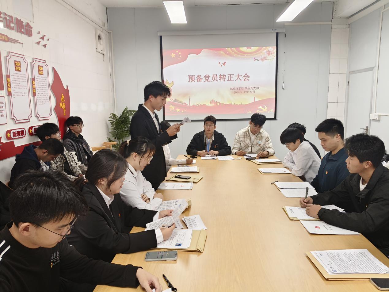 20241223日,网络工程系学生党支部在宏船书院成功召开预备党员转正大会——讨论吴晨曦、王进业、高铭悦、刘雪婷、罗志伟、王鸿彬6预备党员转正的问题。此次会议旨在审议预备党员在预备期间的表现,讨论并表决其转正申请,为党组织吸纳新鲜血液,进一步加强党员队伍建设。