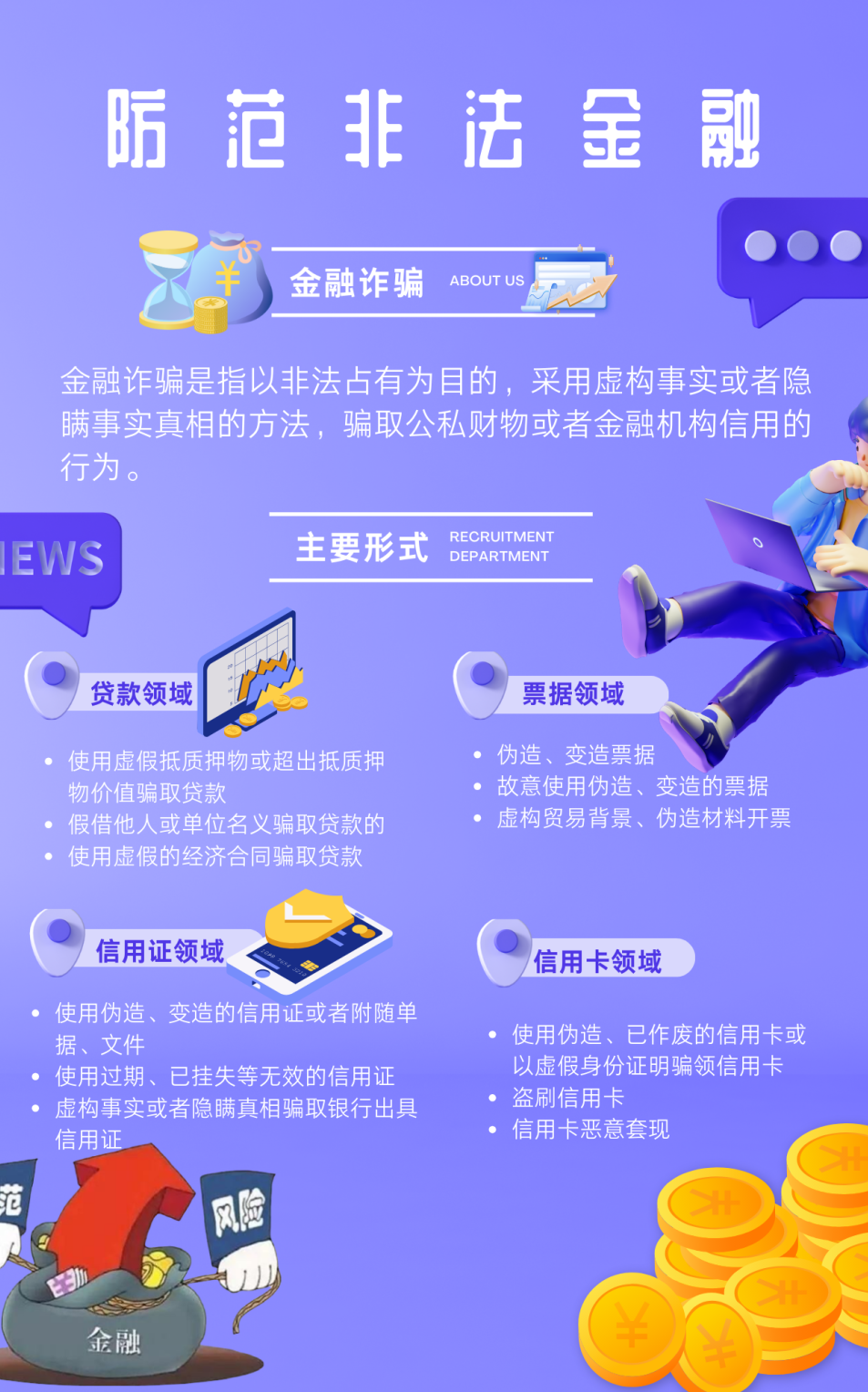 本次活动共收到114份涵盖短视频、海报、漫画等多元形式的参赛作品。获奖作品聚焦非法集资、网络诈骗等常见非法金融行为,以情景短剧、数据可视化、视觉隐喻等创新手法揭示非法金融活动的危害性。非法金融指违反《刑法》《防范和处置非法集资条例》等法规,侵害金融秩序与公众利益的行为,主要包括非法吸收公众存款、集资诈骗、非法发行证券等类型。识别和判断非法金融活动是防范非法金融的第一步。一般来说,非法金融活动具有以下特征:违反国家金融法规、以高额回报为诱饵、面向不特定公众、未经监管部门许可等。对于投资者而言,要提高警惕,仔细辨别金融活动的合法性,防止上当受骗。