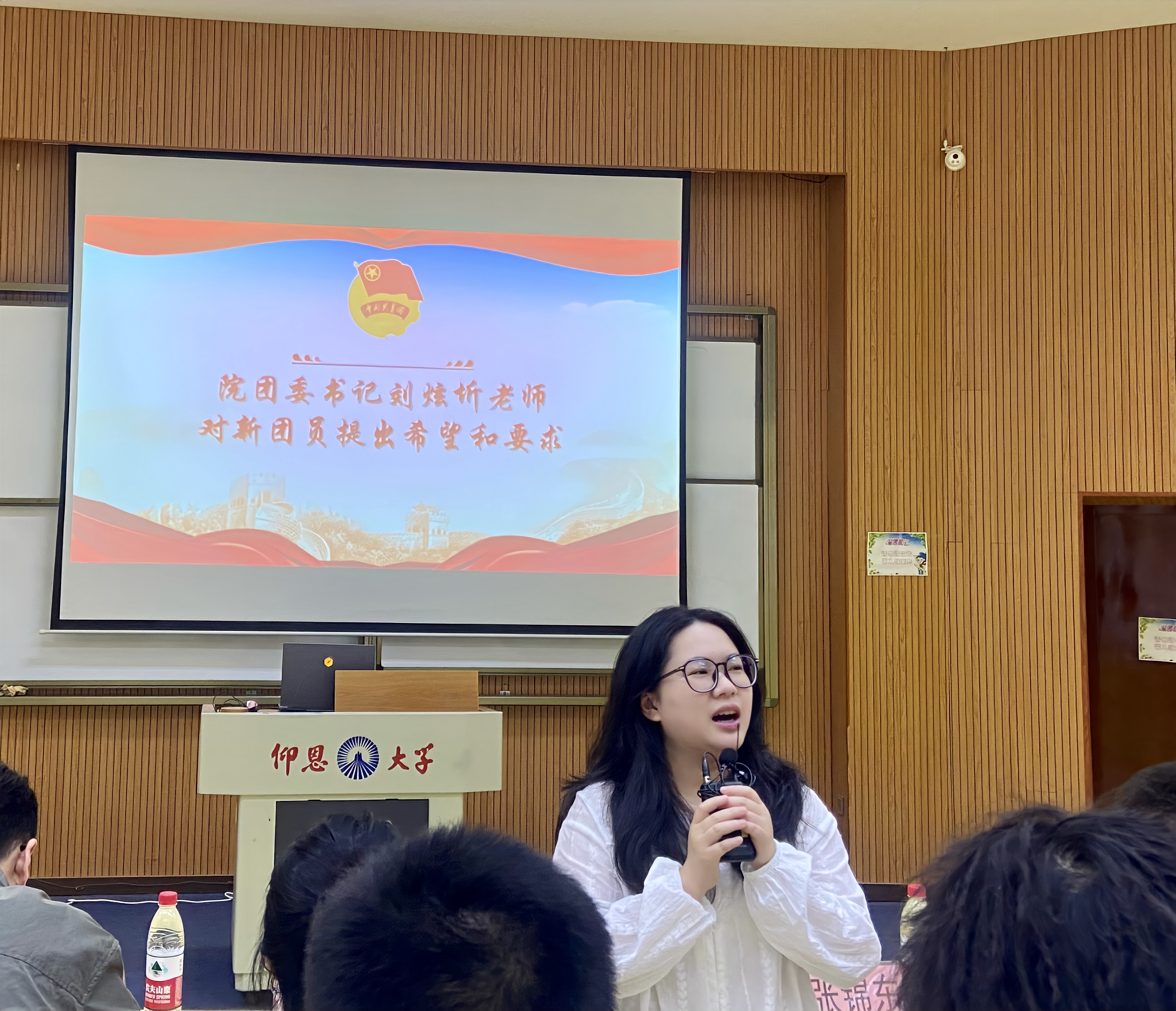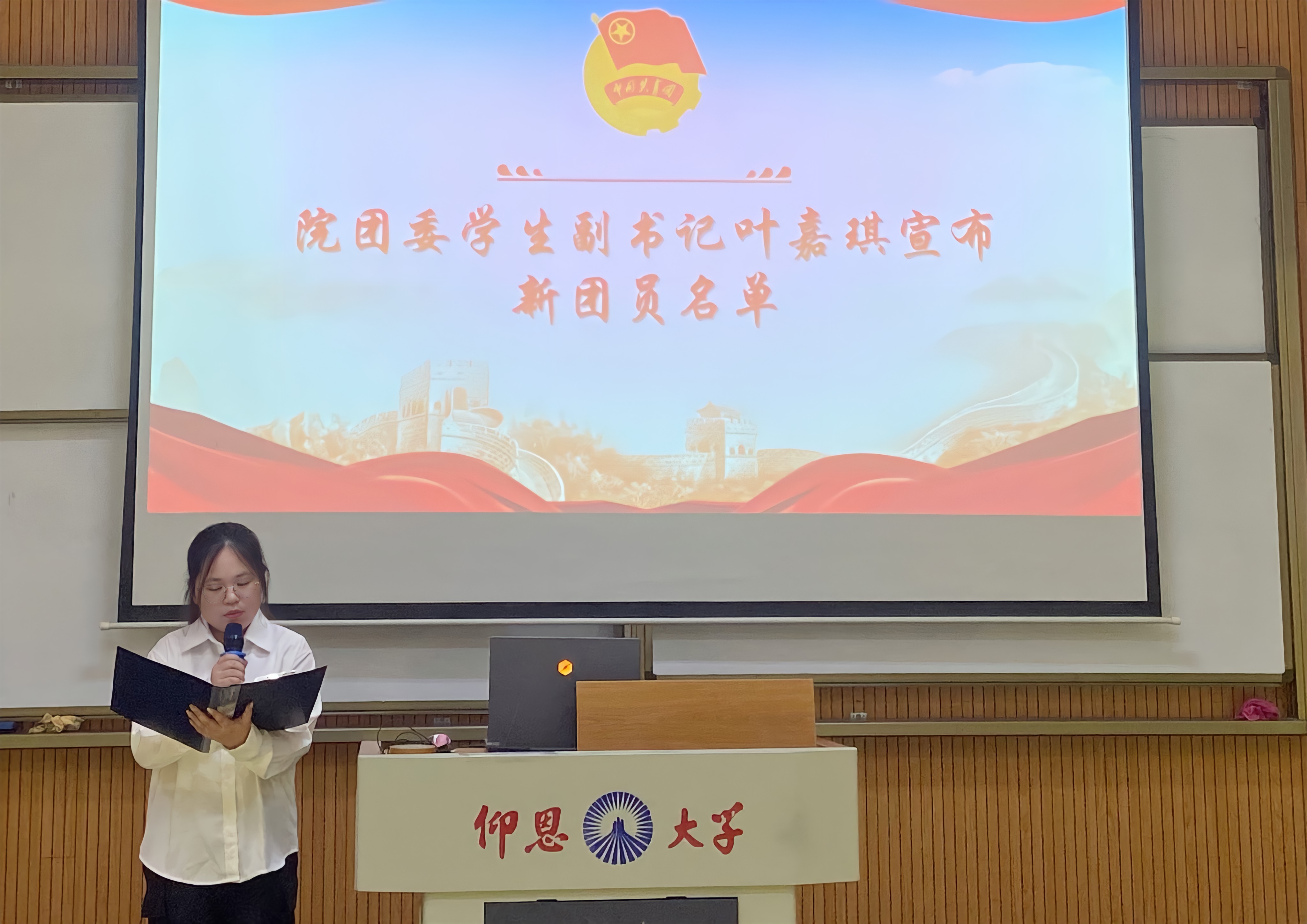 院团委书记刘炫圻老师对新团员提出希望和要求,她勉励新团员要牢记入团誓言,积极进取,始终保持对团的忠诚与热爱,争做新时代优秀共青团员。