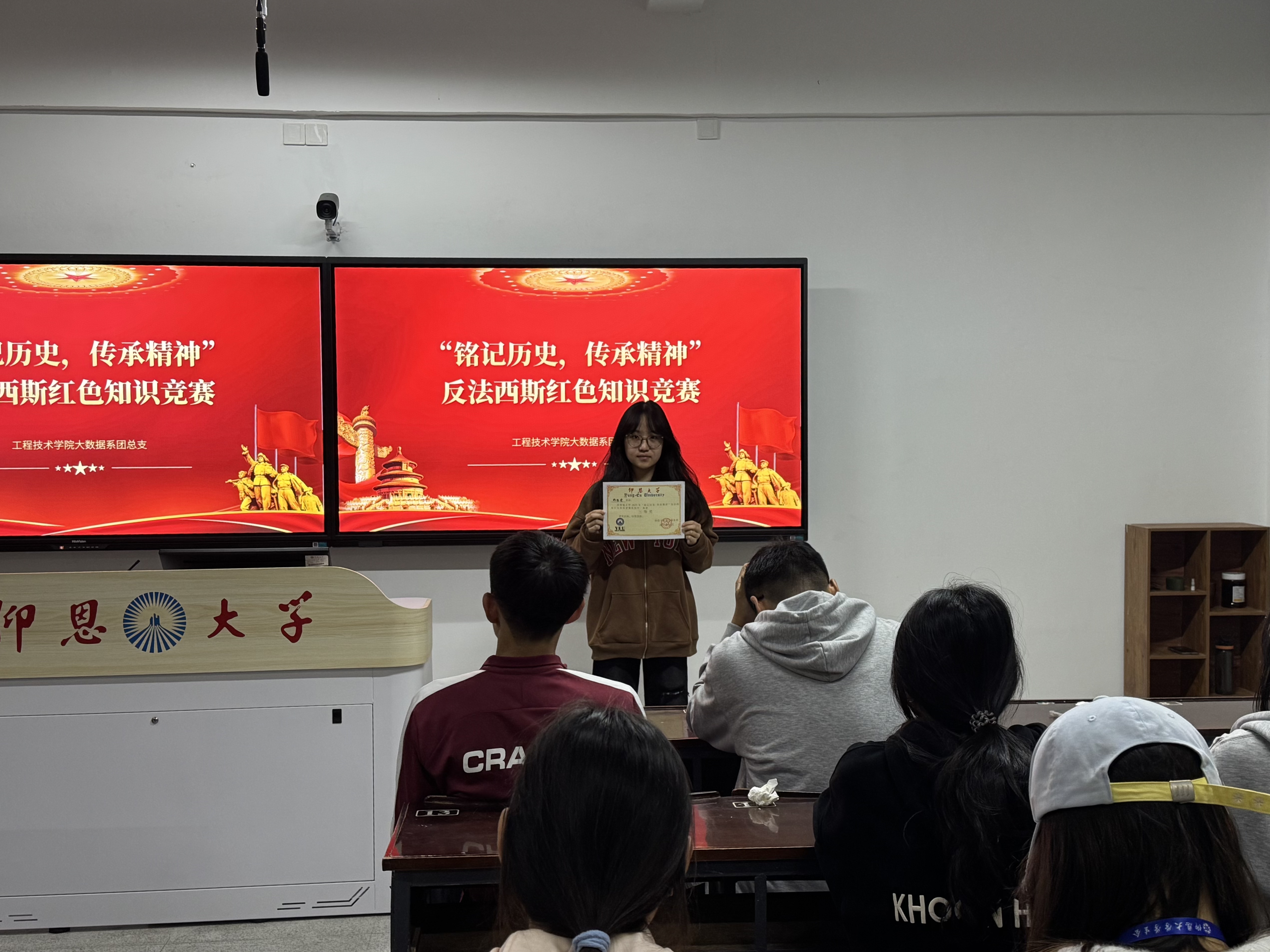 为深化红色文化教育,传承反法西斯精神,夯实师生红色历史知识基础,beat365唯一官方网站数据科学与大数据系学生党支部与团总支联合宏船书院于2025年11月20日成功举办“铭记历史 传承精神”反法西斯红色知识竞赛。本次活动以“以赛促学传红色基因,以知践行承历史使命”为核心,为全校学子搭建了学习红色知识、弘扬爱国精神的优质平台。 活动自启动以来,凭借线上参与的便捷性和红色主题的吸引力,得到广大学生的积极响应,共吸引近150名学生踊跃参与。