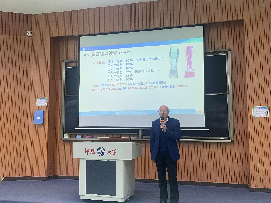 启动会由学院大赛负责人王成刚老师主讲。他首先系统阐述了大背景及其对学生综合能力培养、升学就业的深远意义。随后,他详细解读了本届竞赛规则、不同专业类别的赛制特点与技术要求,并重点发布了贯穿赛前的系统培训方案与校内选拔流程。